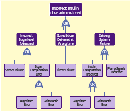 "Another way of assessing hazards is using fault tree analysis. In this process, each of the identified hazards is covered by a detailed analysis to find out what might cause it. Either inductive or deductive reasoning is applied. In the case of software hazards, the usual focus is to determine faults that will cause the system to fail to deliver a system service, such as a monitoring system. A "fault tree" is constructed to link all the possible situations together, to help identify the interrelationships of the failures, which modules may cause them, and what "trickle-down effects" there might be. Here is an example of a fault tree, as applied to the Insulin delivery system from Sommerville...
