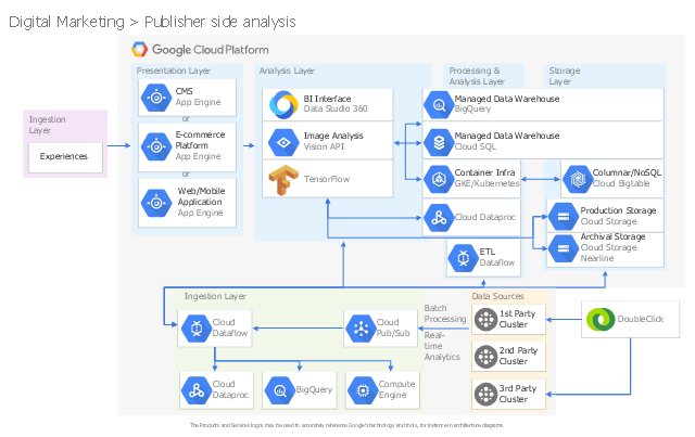 The Google Cloud Platform architectural diagram example "Digital Marketing - Publisher side analysis" was designed using ConceptDraw PRO software extended with Google Cloud Platform solution from Computer and Networks area of ConceptDraw Solution Park.