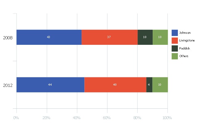 This divided bar diagram sample shows London election results in 2008 and 2012. It was drawn using data from the infographics "London Elections Results by Numbers" on the london.gov.uk website. [data.london.gov.uk/datastore/package/london-elections-results-2012-wards-boroughs-constituency] "There are six types of elections in the United Kingdom: United Kingdom general elections, elections to devolved parliaments and assemblies, elections to the European Parliament, local elections, mayoral elections and Police and Crime Commissioner elections. Elections are held on Election Day, which is conventionally a Thursday. General elections do not have fixed dates, but must be called within five years of the opening of parliament following the last election. Other elections are held on fixed dates, though in the case of the devolved assemblies and parliaments early elections can occur in certain situations. Currently, six electoral systems are used: the single member plurality system (First Past the Post), the multi member plurality system, party list PR, the single transferable vote, the Additional Member System and the Supplementary Vote. Elections are administered locally: in each lower-tier local authority, the actual polling procedure is run by the Returning Officer and the compiling and maintenance of the electoral roll by the Electoral Registration Officer (except in Northern Ireland, where the Electoral Office for Northern Ireland assumes both responsibilities). The Electoral Commission only sets standards for and issues guidelines to Returning Officers and Electoral Registration Officers, but is responsible for nationwide electoral administration (such as the registration of political parties and directing the administration of national referendums)." [Elections in the United Kingdom. Wikipedia] The chart example "London election results" was created using the ConceptDraw PRO diagramming and vector drawing software extended with the Divided Bar Diagrams solution from the Graphs and Charts area of ConceptDraw Solution Park.