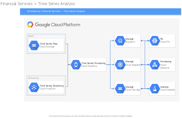 This Google Cloud Platform (GCP) architectural diagram example illustrates financial services and time series analysis. It was drawn on the base of slide 59 from the presentation "Google Cloud Platform official icons and sample diagrams". [cloud.google.com/icons/files/google-cloud-platform-official-icons-and-sample-diagrams.pptx] The Google Cloud Platform architectural diagram example "Financial Services > Time Series Analysis" was designed using ConceptDraw PRO software extended with Google Cloud Platform solution from Computer and Networks area of ConceptDraw Solution Park.