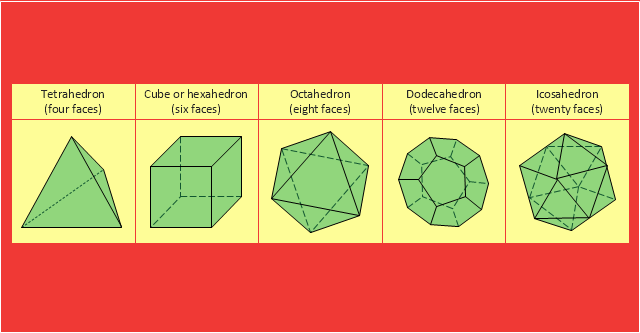 Geometers have studied the mathematical beauty and symmetry of the Platonic solids for thousands of years. They are named for the ancient Greek philosopher Plato who theorized in his dialogue, the Timaeus, that the classical elements were made of these regular solids." [Platonic solid. Wikipedia]