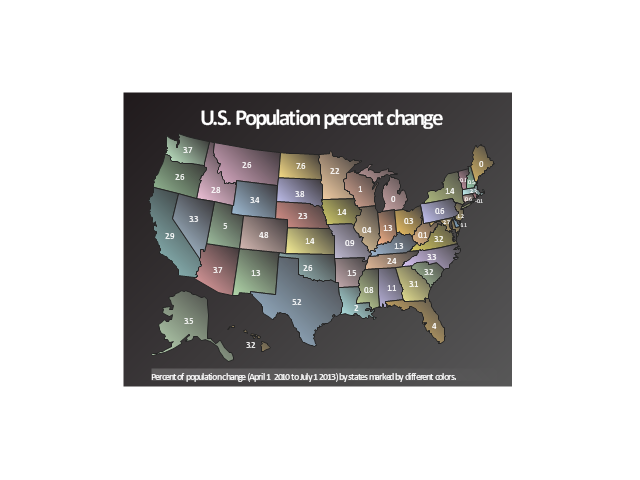 The geospatial dashboard example "U.S. Population, percent change, 2010 to 2013" was created using the ConceptDraw PRO diagramming and vector drawing software extended with the Spatial Dashboard solution from the area "What is a Dashboard" of ConceptDraw Solution Park.