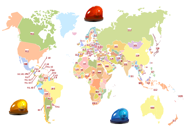 The thematic map example "Emergency number map" is contained in the Safety and Security solution from the Illustration area of ConceptDraw Solution Park.