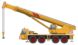 A crane is a type of machine, generally equipped with a hoist, wire ropes or chains, and sheaves, that can be used both to lift and lower materials and to move them horizontally. It is mainly used for lifting heavy things and transporting them to other places. It uses one or more simple machines to create mechanical advantage and thus move loads beyond the normal capability of a human. Cranes are commonly employed in the transport industry for the loading and unloading of freight, in the construction industry for the movement of materials and in the manufacturing industry for the assembling of heavy equipment. A crane mounted on a truck carrier provides the mobility for this type of crane. This crane has two parts: the carrier, often referred to as the Lower, and the lifting component which includes the boom, referred to as the Upper. These are mated together through a turntable, allowing the upper to swing from side to side. These modern hydraulic truck cranes are usually single-engine machines, with the same engine powering the undercarriage and the crane. The upper is usually powered via hydraulics run through the turntable from the pump mounted on the lower. In older model designs of hydraulic truck cranes, there were two engines. One in the lower pulled the crane down the road and ran a hydraulic pump for the outriggers and jacks. The one in the upper ran the upper through a hydraulic pump of its own. Many older operators favor the two-engine system due to leaking seals in the turntable of aging newer design cranes. Generally, these cranes are able to travel on highways, eliminating the need for special equipment to transport the crane unless weight or other size constrictions are in place such as local laws. [Crane (machine). Mobile. Truck-mounted crane. Wikipedia]
