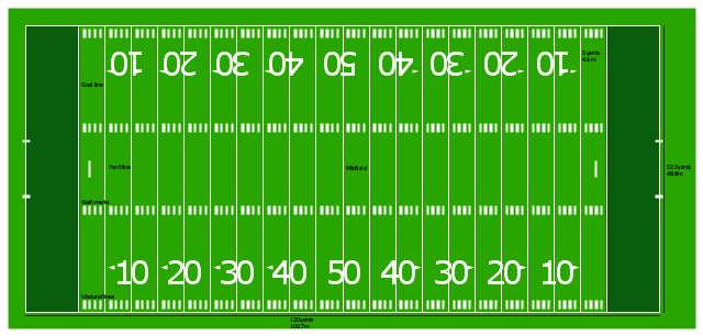 "Football games are played on a rectangular field that measures 120 yards (110 m) long and 53.33 yards (48.76 m) wide. Lines marked along the ends and sides of the field are known respectively as the end lines and side lines, and goal lines are marked 9 yards (8.2 m) outward from each end line. Weighted pylons are placed on the inside corner of the intersections of the goal lines and end lines. White markings on the field identify the distance from the end zone. Inbound lines, or hash marks, are short parallel lines that mark off 1 yard (0.91 m) increments. Yard lines, which run the width of the field, are marked every 5 yards (4.6 m). A line one yard wide is placed at each end of the field. This line is marked at the center of the two-yard line in professional play and at the three-yard line in college play. Numerals that display the yard lines in multiples of ten are placed along both sides of the field. Goalposts are at the center of the plane of each of the two end lines. The crossbar of these posts is ten feet (3 meters) above the ground, with vertical uprights at the end of the crossbar 18 feet 6 inches (6 m) apart for professional and collegiate play and 23 feet 4 inches (7 m) apart for high school play. The uprights extend vertically 10 yards on professional fields, a minimum of 10 yards on college fields, and a minimum of ten feet on high school fields. Goal posts are padded at the base, and orange ribbons are normally placed at the tip of each upright." [American football. Wikipedia] The diagram example "Horizontal colored football field" was created using the ConceptDraw PRO diagramming and vector drawing software extended with the Football solution from the Sport area of ConceptDraw Solution Park.
