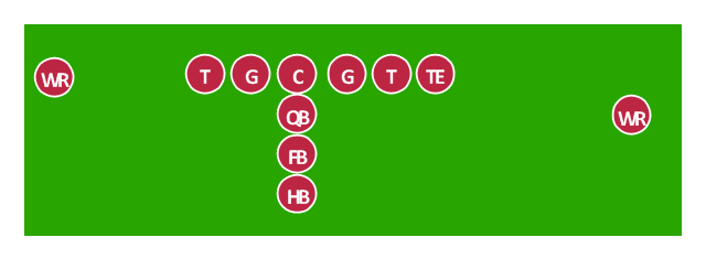 The formation begins with the usual 5 offensive linemen (2 offensive tackles, 2 guards, and a center), the quarterback under center, and two backs in-line behind the quarterback. The base variant adds a tight end to one side of the line and two wide receivers, one at each end of the line." [I formation. Wikipedia]