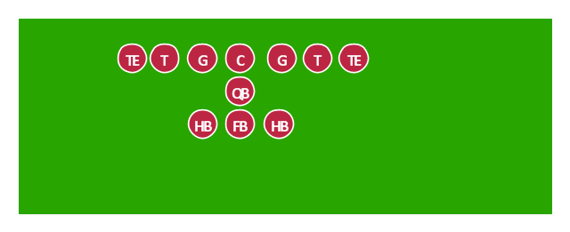 American football positions diagram, tight end, TE, quarterback, QB, offensive tackle, T, offensive guard, G, halfback, fullback, center, C,