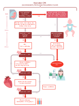 This medical algorithm flowchart sample depicts cardiopulmonary resuscitation (CPR) of newborn infants. It was drawn on the base of Wikimedia Commons file: KPR novorozence.png. [commons.wikimedia.org/wiki/File:KPR_novorozence.png] This file is licensed under the Creative Commons Attribution 3.0 Unported license. [creativecommons.org/licenses/by/3.0/deed.en] "Cardiopulmonary resuscitation (CPR) is an emergency procedure that combines chest compressions often with artificial ventilation in an effort to manually preserve intact brain function until further measures are taken to restore spontaneous blood circulation and breathing in a person who is in cardiac arrest. It is recommended in those who are unresponsive with no breathing or abnormal breathing" [Cardiopulmonary resuscitation. Wikipedia] The medical algorithm flow chart example "Cardiopulmonary resuscitation of newborn infants" was designed using ConceptDraw PRO software extended with Healthcare Workflow Diagrams solution from Business Processes area of ConceptDraw Solution Park.