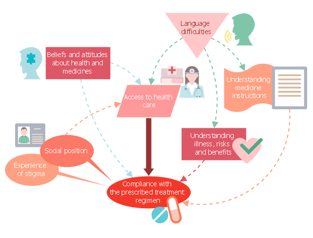 The medical flowchart example "Possible cultural influences on Adherence with medicine taking" was designed using ConceptDraw PRO software extended with Healthcare Workflow Diagrams solution from Business Processes area of ConceptDraw Solution Park.