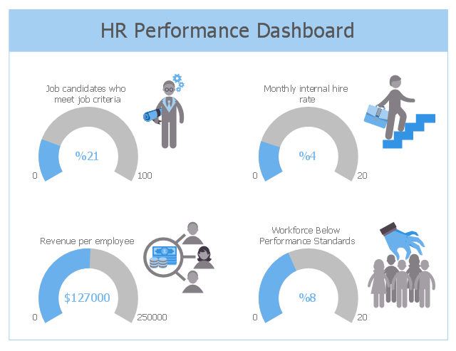 This HR dashboard sample depicts KPIs: job candidates who meet job criteria, monthly internal hire rate, revenue per employee, workforce below performance standards. "Dashboards often provide at-a-glance views of KPIs (key performance indicators) relevant to a particular objective or business process (e.g. sales, marketing, human resources, or production). ... a human resources dashboard may show numbers related to staff recruitment, retention and composition, for example number of open positions, or average days or cost per recruitment." [Dashboard (business). Wikipedia] The human resources dashboard example "HR Performance Dashboard" was designed using ConceptDraw PRO software extended with HR Dashboard solution from Management area of ConceptDraw Solution Park.
