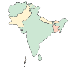"South Asia or Southern Asia is the southern region of the Asian continent, which comprises the sub-Himalayan countries and, for some authorities, adjoining countries to the west and east. Topographically, it is dominated by the Indian Plate, which rises above sea level as northern parts of India south of the Himalayas and the Hindu Kush. South Asia is bounded on the south by the Indian Ocean and on land (clockwise, from west) by West Asia, Central Asia, East Asia, and Southeast Asia. The current territories of Bangladesh, India, Sri Lanka and Pakistan form the core countries of South Asia, while Nepal, Bhutan, Afghanistan, and Maldives are generally included. By various deviating definitions based on often substantially different reasons, the British Indian Ocean Territory, Maldives, Iran and the Tibet Autonomous Region are included as well." [South Asia. Wikipedia]