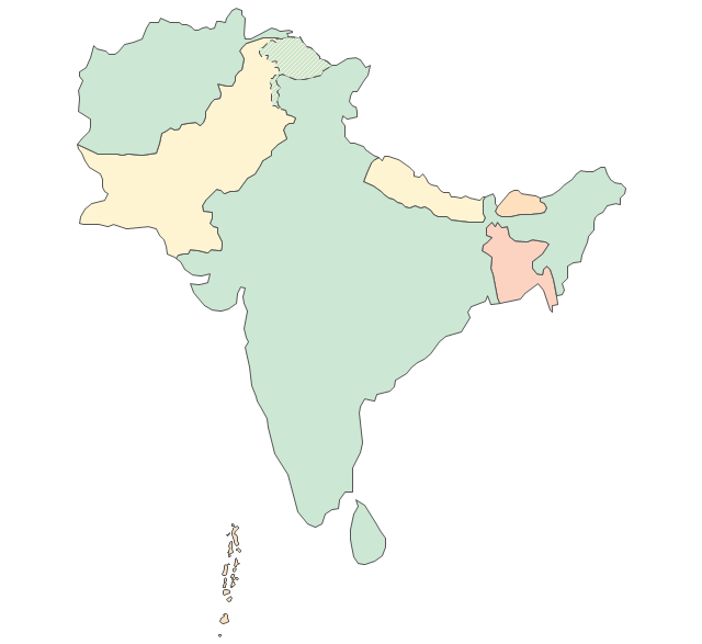 "South Asia or Southern Asia is the southern region of the Asian continent, which comprises the sub-Himalayan countries and, for some authorities, adjoining countries to the west and east. Topographically, it is dominated by the Indian Plate, which rises above sea level as northern parts of India south of the Himalayas and the Hindu Kush. South Asia is bounded on the south by the Indian Ocean and on land (clockwise, from west) by West Asia, Central Asia, East Asia, and Southeast Asia. The current territories of Bangladesh, India, Sri Lanka and Pakistan form the core countries of South Asia, while Nepal, Bhutan, Afghanistan, and Maldives are generally included. By various deviating definitions based on often substantially different reasons, the British Indian Ocean Territory, Maldives, Iran and the Tibet Autonomous Region are included as well." [South Asia. Wikipedia]
