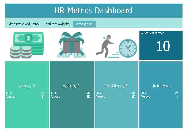 This HR dashboard template for ConceptDraw PRO software consits of single digital value indicator, multi digital values indicators, tab set and icons.
