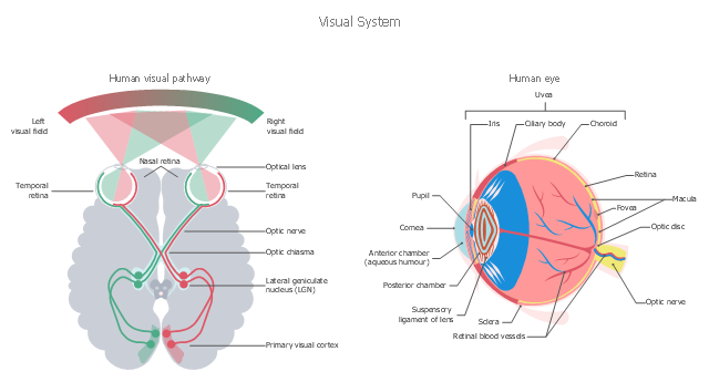 This anatomy illustration sample depicts human visual system. "The visual system is the part of the central nervous system which gives organisms the ability to process visual detail, as well as enabling the formation of several non-image photo response functions. It detects and interprets information from visible light to build a representation of the surrounding environment. ... Structure: * The eye, especially the retina * The optic nerve * The optic chiasma * The optic tract * The lateral geniculate body * The optic radiation * The visual cortex * The visual association cortex. These are divided into anterior and posterior pathways. The anterior visual pathway refers to structures involved in vision before the lateral geniculate nucleus. The posterior visual pathway refers to structures after this point." [Visual system. Wikipedia] The human anatomy illustration example "Visual system" was created using ConceptDraw PRO software extended with Human Anatomy solution from Health area of ConceptDraw Solution Park.
