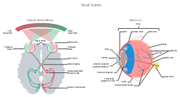 These are divided into anterior and posterior pathways. The anterior visual pathway refers to structures involved in vision before the lateral geniculate nucleus. The posterior visual pathway refers to structures after this point." [Visual system. Wikipedia]