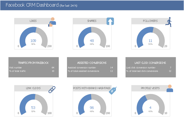 The social CRM dashboard example "Facebook CRM Dashboard" was designed using ConceptDraw PRO software extended with CRM Center Dashboard solution from Management area of ConceptDraw Solution Park.