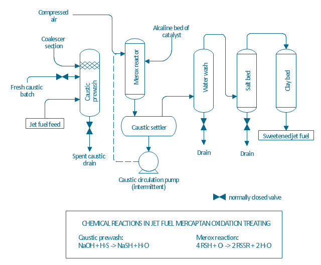 The process flow diagram (PFD) example "Jet fuel mercaptan oxidation treating" was drawn using the ConceptDraw PRO software extended with the Chemical and Process Engineering solution from the Chemical and Process Engineering area of ConceptDraw Solution Park.