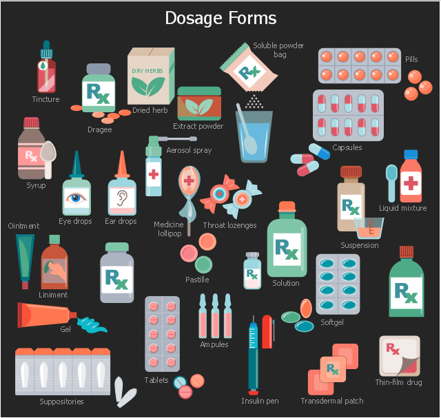 The pharmaceutical drugs infographic example "Dosage forms" was designed using ConceptDraw PRO software extended with Pharmacy Illustrations solution from Health area of ConceptDraw Solution Park.