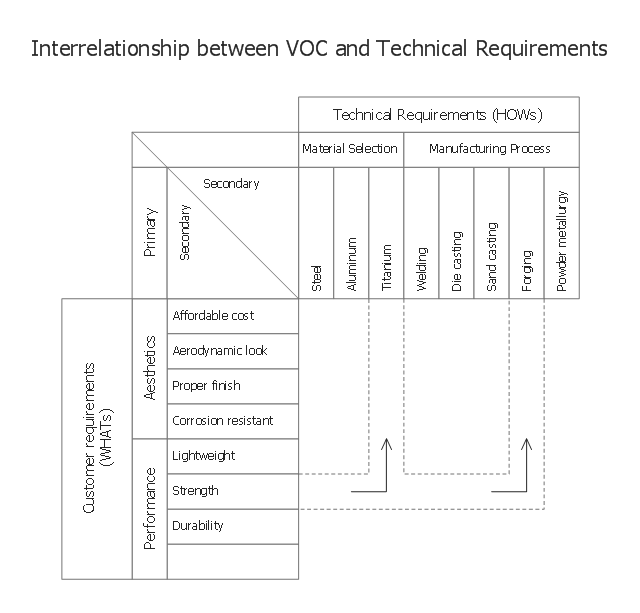 The HOQ example "House of Quality - VOC vs. Technical Requirements" was designed using ConceptDraw PRO software extended with House of Quality solution from Quality area of ConceptDraw PRO Solution Park.