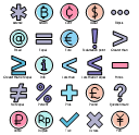 The vector stencil library "Decision signs" contains 25 mathematical symbols, currency signs and punctuation marks.