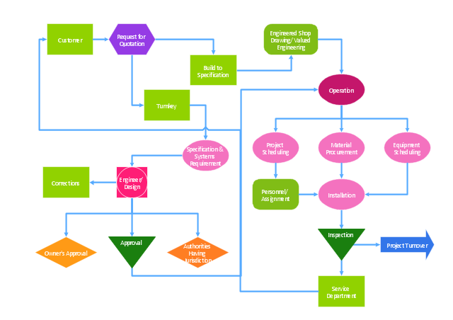 "The Process Flow Chart provides a visual representation of the steps in a process. ... When to Use: One of the first activities of a process improvement effort is constructing a flowchart. It provides the following benefits: 1- It give you and everyone a clear understanding of the process. 2- Facilitates teamwork and communication. 3- Helps to identify non-value-added operations." [bexcellence.org/Flow-Chart.html] This TQM diagram example shows a business process that can be then analyzed to improve the effectiveness and diagnose quality issues that require resolution. This example was created using the ConceptDraw PRO diagramming and vector drawing software extended with the Total Quality Management (TQM) Diagrams solution from the Quality area of ConceptDraw Solution Park.