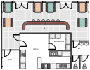 This bakery floor plan sample shows baking equipment and bakery cafe furniture layout.