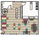 Equipment and furniture layout, window, casement, toilet paper holder, toilet, square table, table, spiral staircase, spinet piano, sofa, salad bar, round table, table, round stool, room, refrigerator, freezer, rectangular table, table, range, grill, pedestal sink, gas range, folding chair, exterior wall, door, curved back, chair, chest freezer, center table leaf, table leaf, basin,