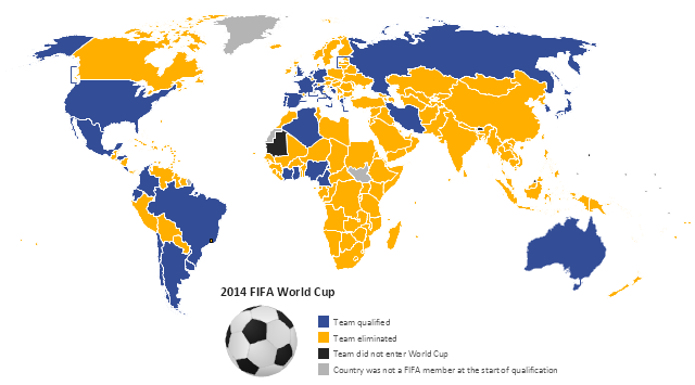 This football (soccer) spatial infographics example uses world thematic map to visualize status of countries with respect to 2014 FIFA World Cup: Team qualified, Team eliminated, Team did not enter World Cup, Country was not a FIFA member at the start of qualification.