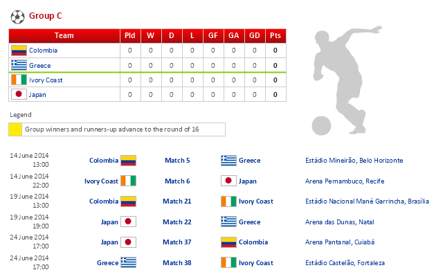 The infographics example "2014 FIFA World Cup - Standings - Group C" was created using the ConceptDraw PRO diagramming and vector drawing software extended with the Soccer solution from the Sport area of ConceptDraw Solution Park.