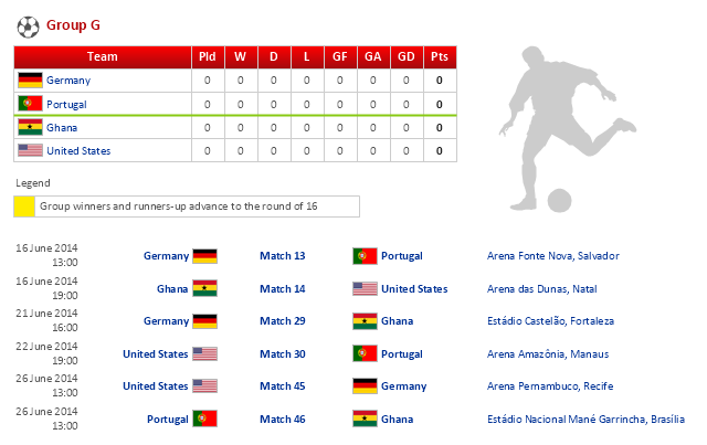 The infographics example "2014 FIFA World Cup - Standings - Group G" was created using the ConceptDraw PRO diagramming and vector drawing software extended with the Soccer solution from the Sport area of ConceptDraw Solution Park.