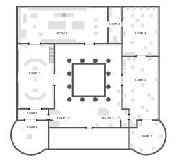Expo stand layout, wall, square table, table, room, opening, island, circular column, column, bevel counter, bent counter,