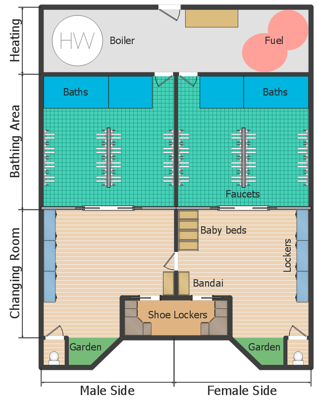 The example "Sentō layout floor plan " was designed using ConceptDraw PRO software extended with Floor Plans solution from Building Plans area of ConceptDraw PRO Solution Park.