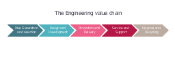 This step chart sample was redesigned from the file: The engineering value chain.png. "The engineering value chain (EVC) refers to a series of engineering activities and capabilities contributing to value creation encompassing essential elements such as idea generation & selection, design & development, production & delivery, service & support, and disposal & recycling for example." [commons.wikimedia.org/wiki/File:The_engineering_value_chain.png]
