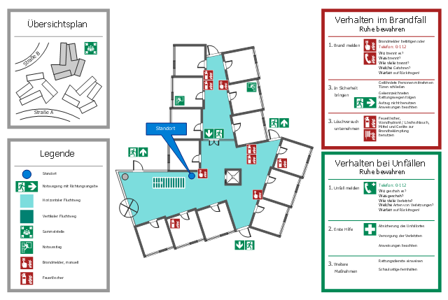 This floor plan example was designed on the base of Wikimedia Commons File: Muster eines Flucht- und Rettungsplans.PNG.