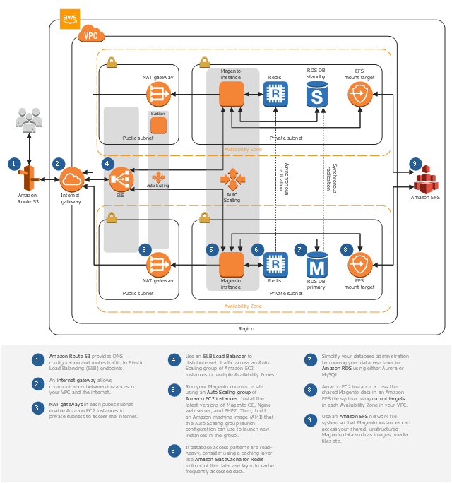 The Amazon Web Services diagram example "Magento CE Hosting on AWS" was designed using ConceptDraw PRO software extended with AWS Architecture Diagrams solution from Computer and Networks area of ConceptDraw Solution Park.