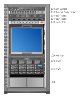 A rack diagram is useful for designing and documenting of network rack server equipment (19-inch or 23-inch rack, rack cabinet, rack unit, network switch, router, KVM switch, server) of data centers, ISP facilities and corporate server rooms.