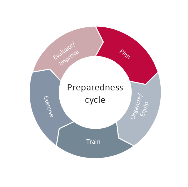 This arrow ring chart sample was created on the base of the figure illustrating the webpage "National Preparedness Cycle. Plan" from the Federal Emergency Management Agency (FEMA) website. "Planning makes it possible to manage the entire life cycle of a potential crisis. Strategic and operational planning establishes priorities, identifies expected levels of performance and capability requirements, provides the standard for assessing capabilities and helps stakeholders learn their roles. The planning elements identify what an organization’s Standard Operating Procedures (SOPs) or Emergency Operations Plans (EOPs) should include for ensuring that contingencies are in place for delivering the capability during a large-scale disaster." [fema.gov/plan] The arrow ring chart example "National Preparedness Cycle" was created using the ConceptDraw PRO diagramming and vector drawing software extended with the Target and Circular Diagrams solution from the Marketing area of ConceptDraw Solution Park. www.conceptdraw.com/solution-park/marketing-target-and-circular-diagrams