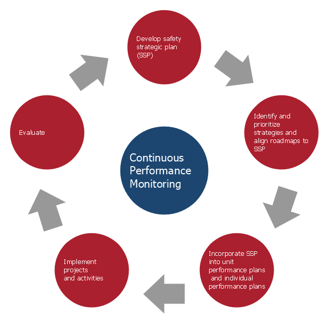 This arrow loop diagram sample was created on the base of the figure illustrating the webpage "Safe Roads for a Safer Future A Joint Safety Strategic Plan" from the website of US Department of Transportation - Federal Highway Administration (FHWA) Office of Safety. "STRATEGIC PLANNING CYCLE. After the safety units issue the SSP, they will identify and prioritize strategies to support the established goals. Many strategies will originate in existing roadmaps or in other program planning activities. The safety units will also use this information when developing their Unit Performance Plans and individual performance plans. Teams within each safety unit will carry out projects and activities to support identified strategies and achieve the SSP goals. The SSP process also includes continuous performance monitoring and evaluation through which the safety units will review past accomplishments against the established goals, consider how well strategies are implemented, assess progress toward goals, identify risks, consider changes in the environment, and discuss future strategic direction. As a part of the evaluation process, the three safety units will recognize achievements and discuss the need for adjustments. Figure ... shows the strategic planning cycle. The safety units will update the SSP every 3 to 5 years using input from a variety of sources, including evaluations, safety trends, and legislative changes." [safety.fhwa.dot.gov/ssp/] The arrow loop diagram example "Strategic planning cycle" was created using the ConceptDraw PRO diagramming and vector drawing software extended with the Target and Circular Diagrams solution from the Marketing area of ConceptDraw Solution Park. www.conceptdraw.com/solution-park/marketing-target-and-circular-diagrams