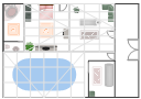 Floor plan, wardrobe, wall, toilet, tanning bed, square rug, spa tub, sofa, sectional sofa, left arm, room, rolling chair, rectangular table, table, rectangular rug, plant, potted plant, pedestal sink, oval pool, oval-shaped pool, pool, opening, massage table, flat screen, TV, double door, double bed, door, armless sectional sofa, sectional sofa, Georgian conservatory,