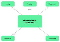 "A concept map is a diagram showing the relationships among concepts, with the concepts drawn in rectangular boxes (or other shapes), which are connected with labelled lines (or arrows) that denote the relationships between concepts, such as "is a", "gives rise to", "results in", "is required by," or "contributes to". ... The concept map can take the shape and composition of other map types. They can take the shape of the context diagram, tree diagram or venn diagram, but other shapes and compositions are also possible. ... A concept map can be drawn with all kinds of elements: (1) Text and lines. (2) Blocks and arrows. (3) Circles. (4) Additional text. (5) Additional listings. (6) Additional icons. (7) Additional Illustration (as groundplan). (8) Additional legenda. ... A concept map shows a number of elements, relations and/or properties in one or more layers. ... The relation between the elements can be pictures with specific shapes (lines, arrow)." [Concept map. Wikimedia Commons] This concept map example was redesigned from the Wikimedia Commons file: Information systems in the Schools.jpg. [commons.wikimedia.org/wiki/File:Information_systems_in_the_Schools.jpg] This file is licensed under the Creative Commons Attribution-Share Alike 3.0 Unported license. [creativecommons.org/licenses/by-sa/3.0/deed.en] The example "Information systems in the schools" was created using the ConceptDraw PRO diagramming and vector drawing software extended with the Concept Maps solution from the area "What is a Diagram" of ConceptDraw Solution Park.