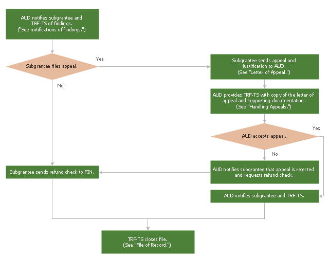 This audit flowchart sample was created on the base of the figure illustrating the webpage "Section 5: Resolving Audit Findings Pertaining to Site Audits" from the website of TxDOT Online Manuals. "Site Audits. In addition to audit coverage utilizing the single audit approach, The Texas Department of Transportation (TxDOT) Audit Office (AUD) conducts requested site audits each year on selected projects. Site audits are handled using AUD’s normal site audit procedures. AUD forwards any findings noted during the audit directly to the subgrantee for collection of the moneys due or other resolution as appropriate. Information copies are provided to the TRF-TS program managers and to the districts when appropriate." [onlinemanuals.txdot.gov/txdotmanuals/tfc/resolving_audit_findings_pertaining_to_site_audits.htm] The audit flowchart example "Overview of resolution process following an Audit Office finding" was created using the ConceptDraw PRO diagramming and vector drawing software extended with the Audit Flowcharts solution from the Finance and Accounting area of ConceptDraw Solution Park. www.conceptdraw.com/solution-park/finance-audit-flowcharts
