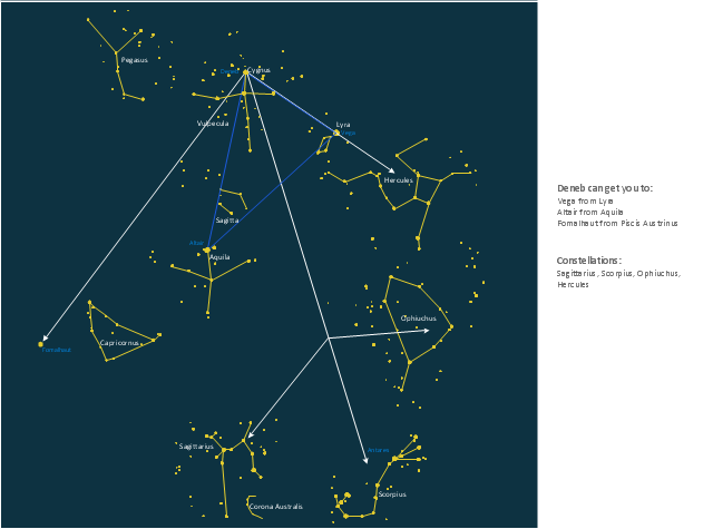The astronomical diagram example "Summer triangle network" was created using the ConceptDraw PRO diagramming and vector drawing software extended with the Astronomy solution from the Science and Education area of ConceptDraw Solution Park.