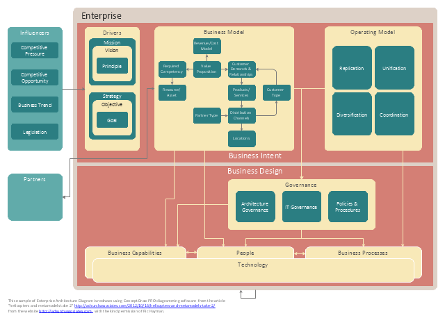 The example "Enterprise architecture diagram" was created using the ConceptDraw PRO diagramming and vector drawing software extended with the Enterprise Architecture Diagrams solution from the Management area of ConceptDraw Solution Park.