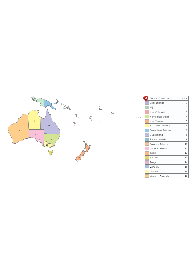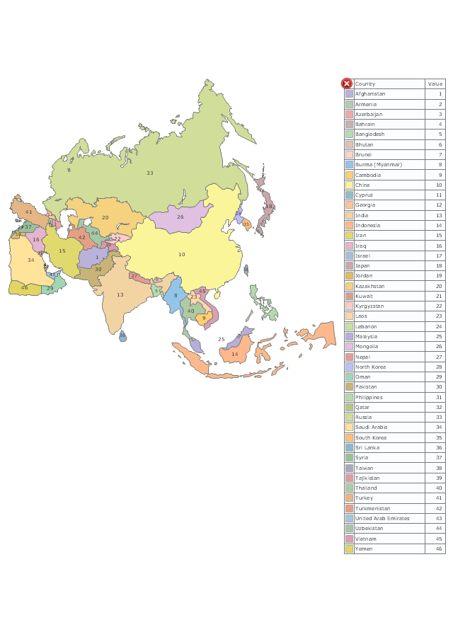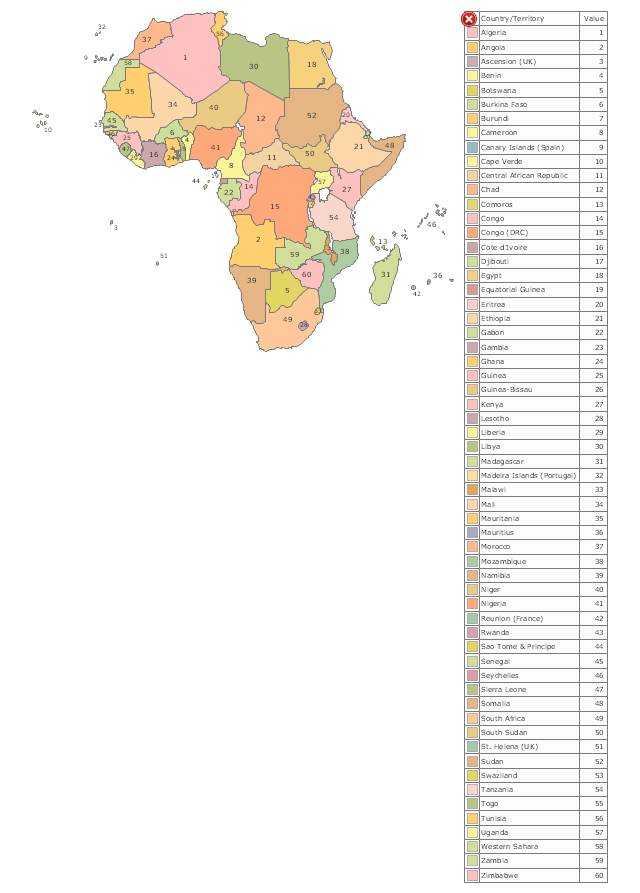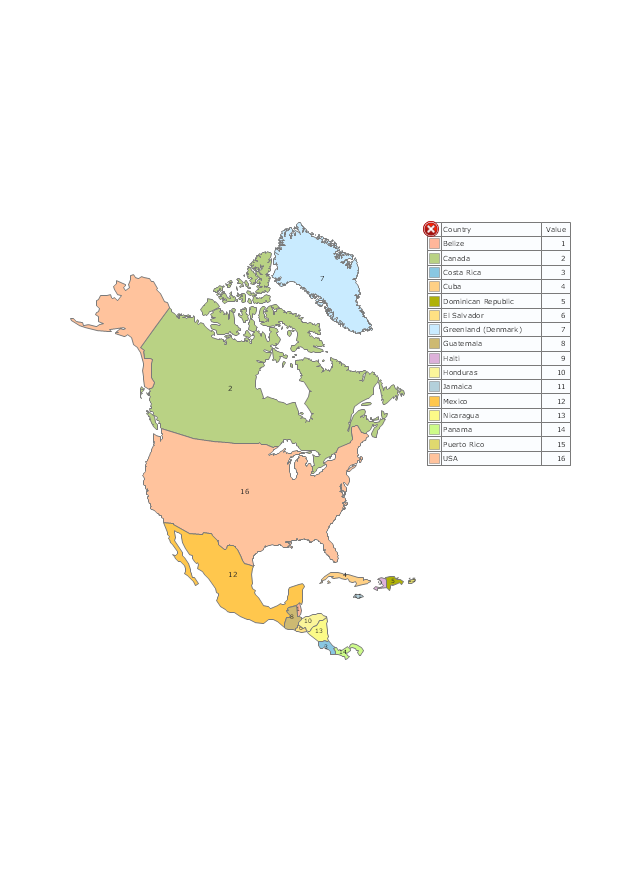 Use it for drawing thematic maps of geographic regions displaying the metric values by countries, states and territories marked by different colors in the ConceptDraw PRO diagramming and vector drawing software extended with the Spatial Dashboard solution from the area "What is a Dashboard" of ConceptDraw Solution Park.