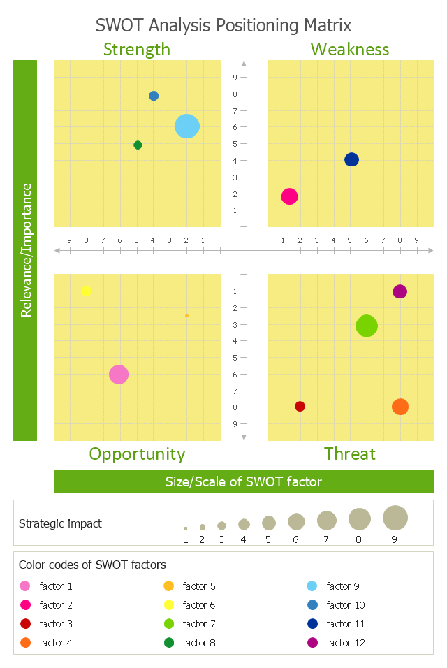 This SWOT analysis matrix template helps you in positioning of SWOT factors as bubbles on bubble chart by size/scale (X axis) and relevance/importance (Y axis). The diameter of bubbles shows strategic impact of SWOT factors.