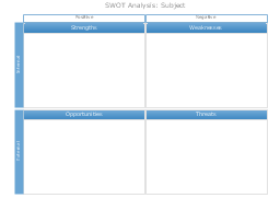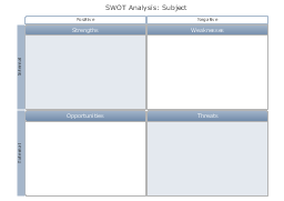 The vector stencils library "SWOT" contains 19 SWOT and TOWS analysis matrix diagram templates. Use it to create your SWOT and TOWS matrices in the ConceptDraw PRO diagramming and vector drawing software extended with the SWOT Analysis solution from the Management area of ConceptDraw Solution Park.