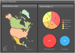 This dashboard demonstrates how sales are distributed by geography using thematic map, pie chart and bubble indicator. The map presentation of sales data is a great way to see how each territory is performing with just a glance. The performance dashboard example "Sales geographically" was created using the ConceptDraw PRO diagramming and vector drawing software extended with the Sales Dashboard solution from the Marketing area of ConceptDraw Solution Park.