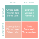 4. Unimportant / Not Urgent quadrant are dropped e.g. time wasters, pleasant activities, trivia." [The Eisenhower Method. Time management. Wikipedia]