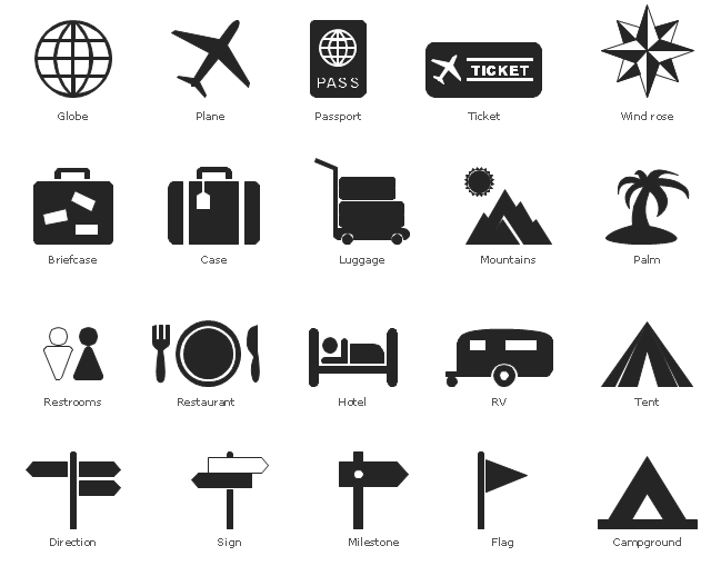 The vector stencils library "Travel and tourism pictograms" contains 20 travel and tourism pictograms.
