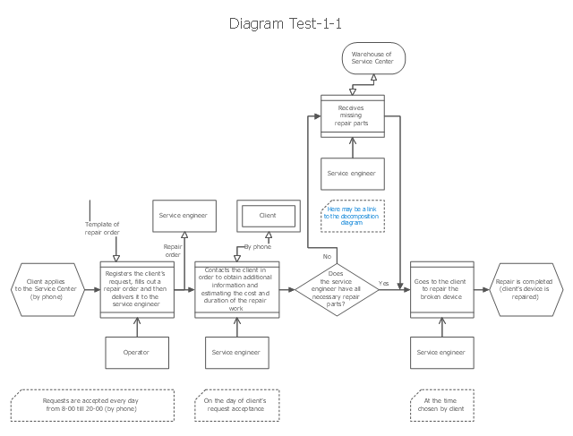 − Service engineer goes to the client and repairs the broken device at the time chosen by the client." [Specification of CH-1 notation. http://ch1-notation.blogspot.ru/2011/10/ch-1-notation-for-business-process.html]